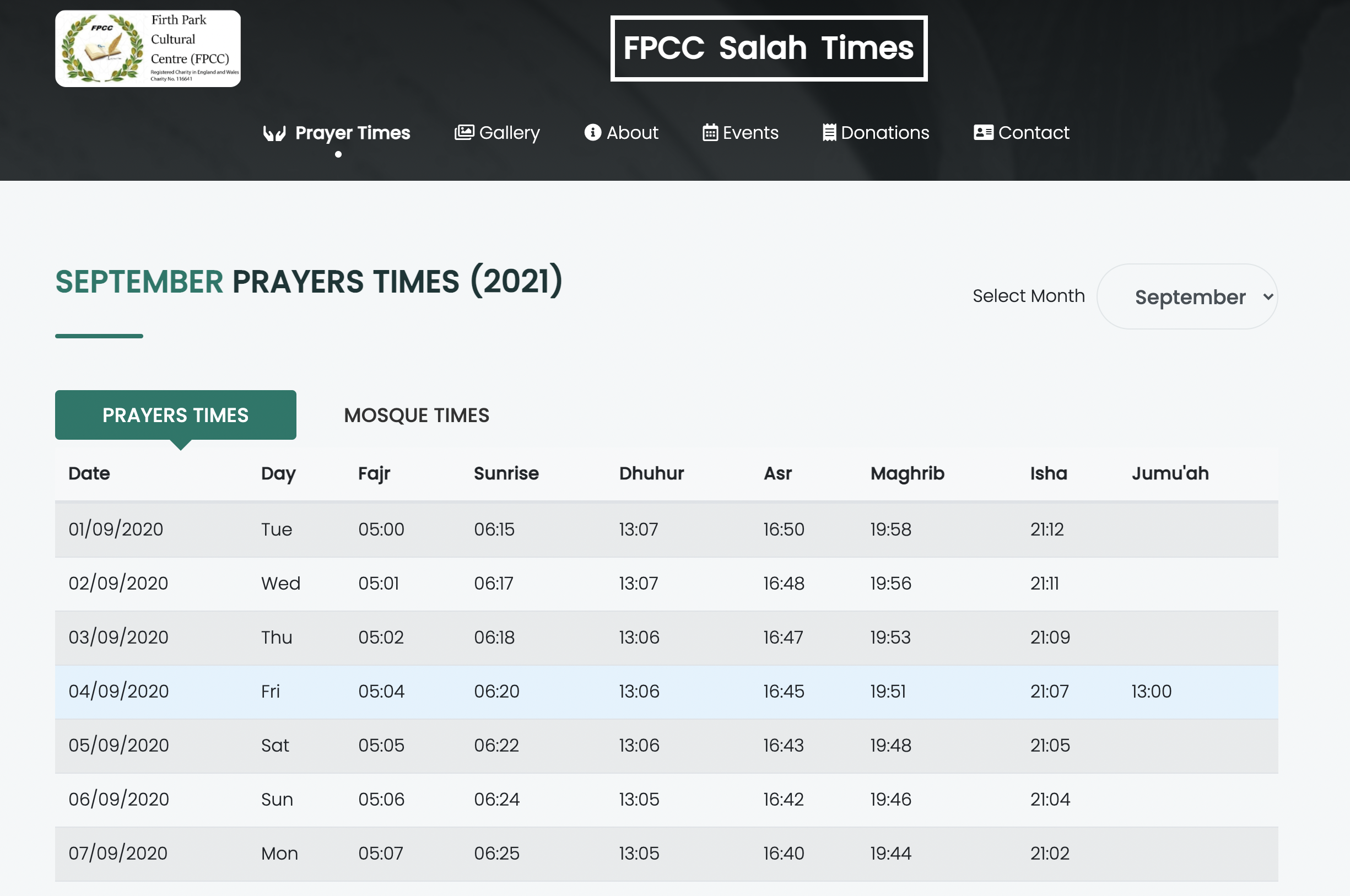 | Date | Day | Fajr | Sunrise | Dhuhur | Asr | Maghrib | Isha | Jumu'ah |